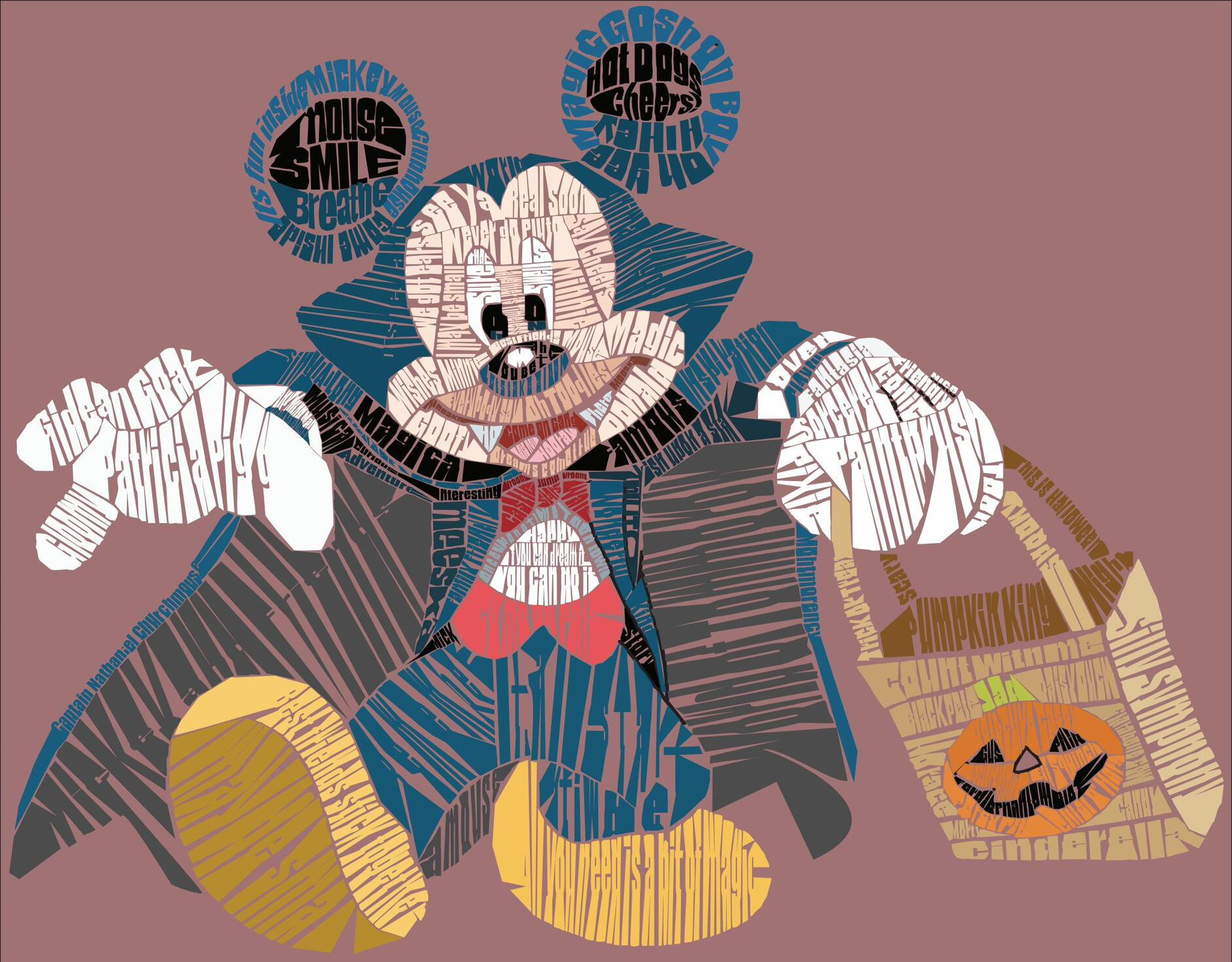 Used just words related to the character, such as names and phrases, to create an impactful visual.